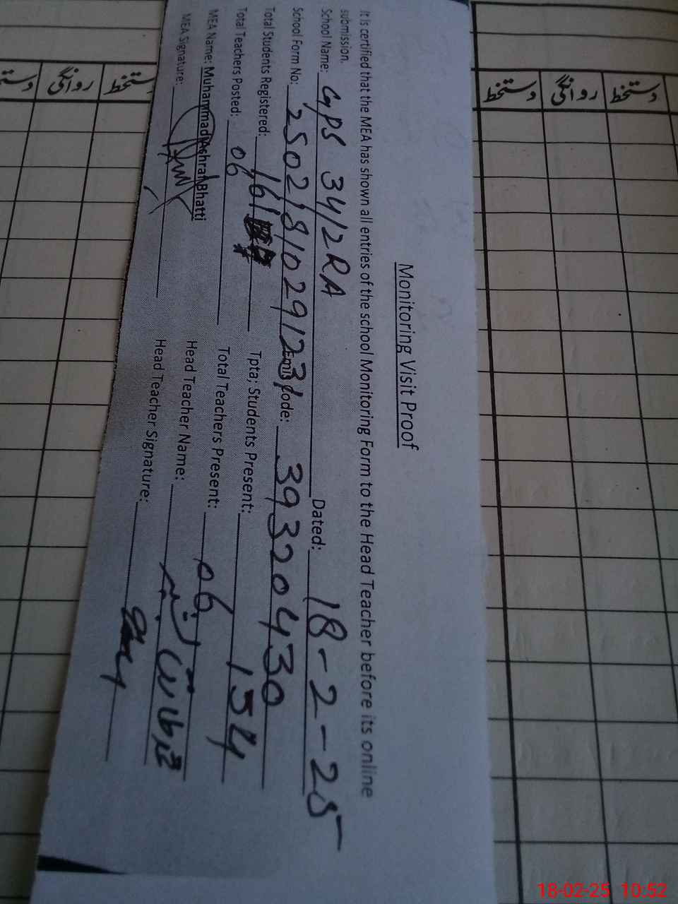 | Attendance Register | Head Teacher | MEA with School | Visit Proof |