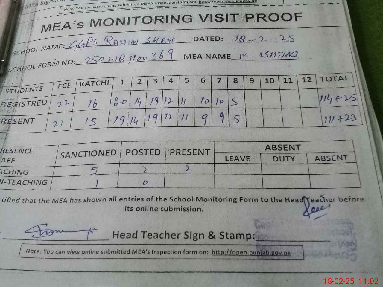 | Attendance Register | Head Teacher | MEA with School | Visit Proof |