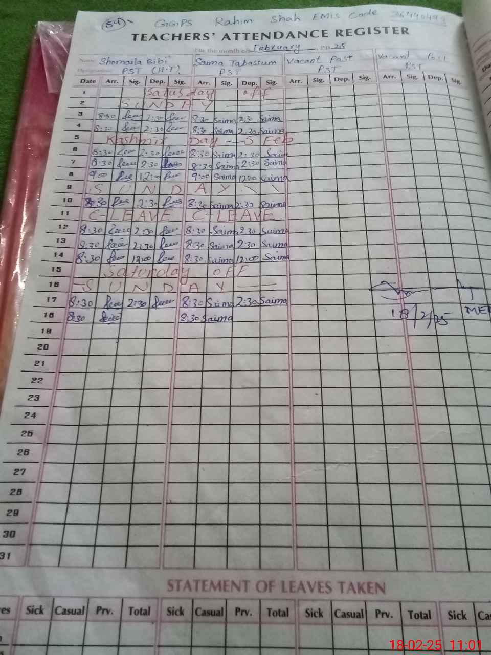 | CNIC | Full Name | Designation | R/C | Absence During Last Calender Month |