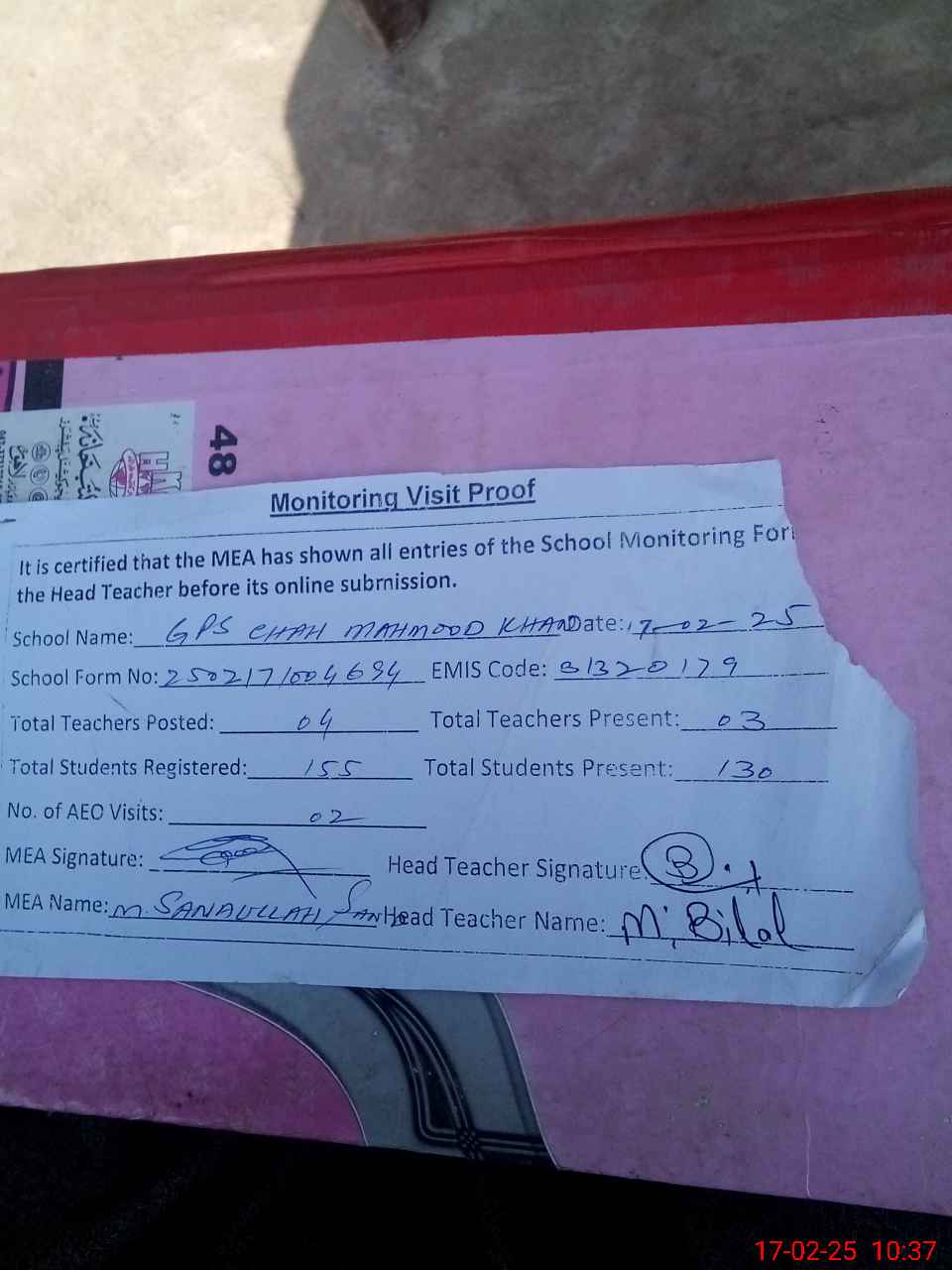 | Attendance Register | Head Teacher | MEA with School | Visit Proof |