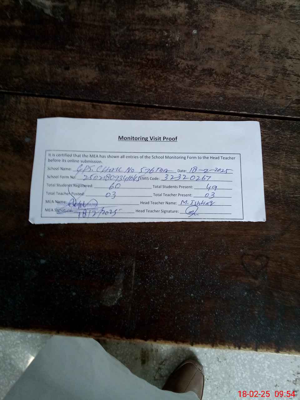 | Attendance Register | Head Teacher | MEA with School | Visit Proof |