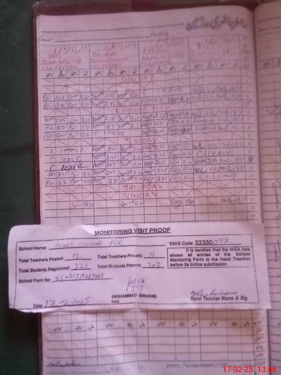 | Attendance Register | Head Teacher | MEA with School | Visit Proof |
