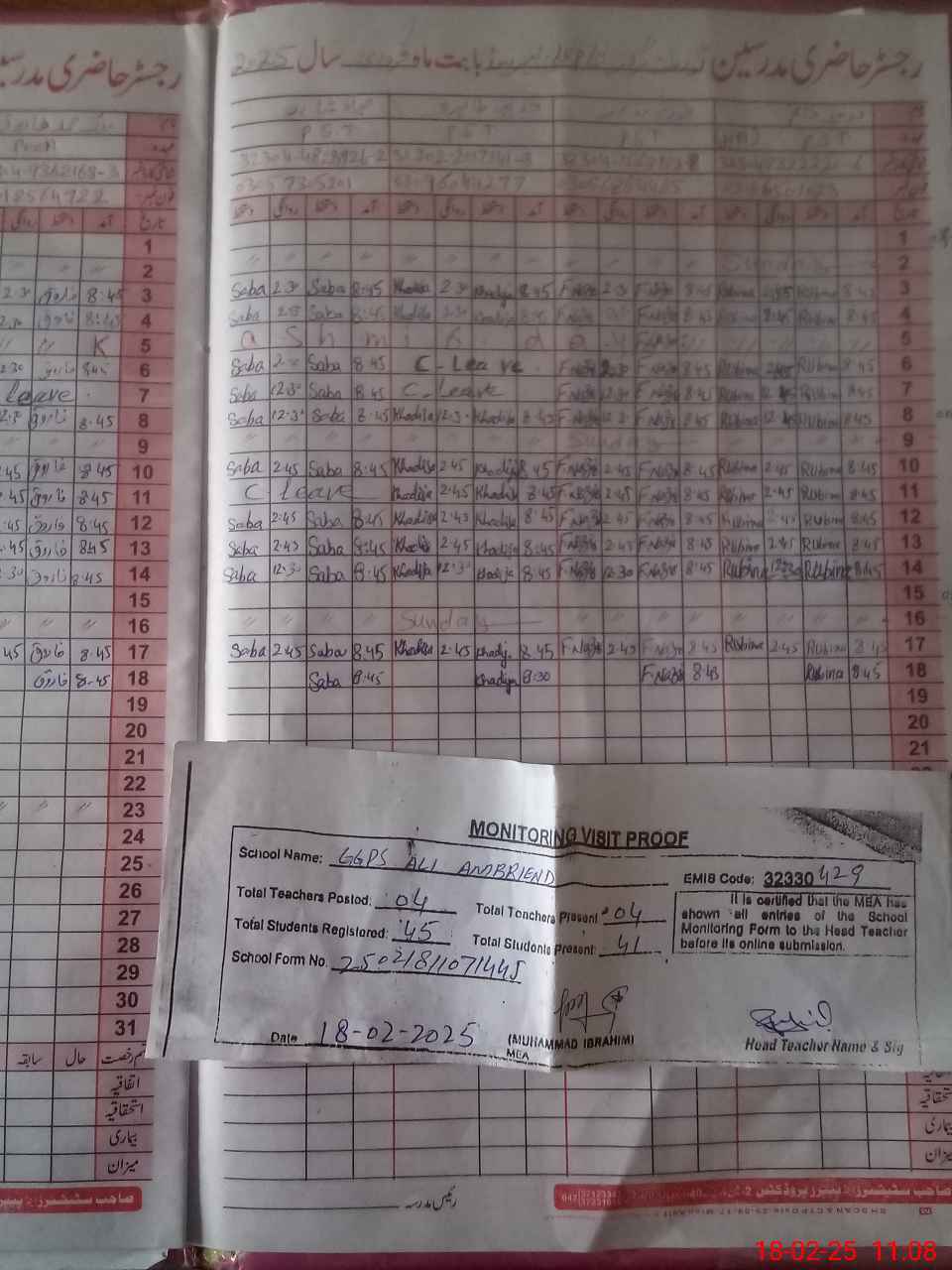 | Attendance Register | Head Teacher | MEA with School | Visit Proof |