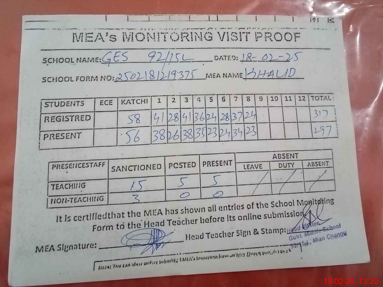 | EMIS Code: 36430064 | Name of School: GES 92/15-L, MIAN CHANNU | |||