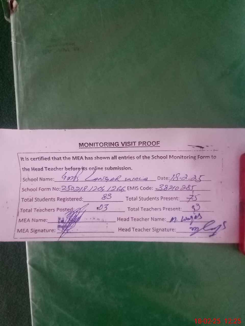 | EMIS Code: 38210285 | Name of School: GMPS LANGAR WALA | |||