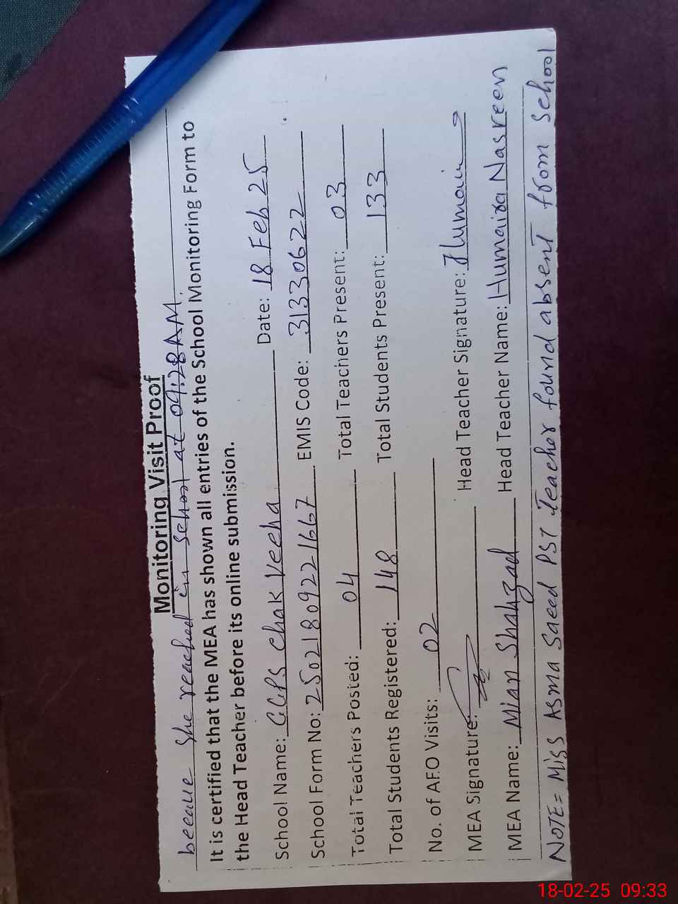 | Attendance Register | Head Teacher | MEA with School | Visit Proof |