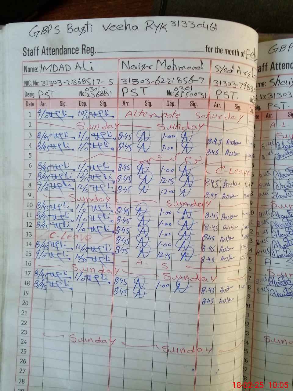 | CNIC | Full Name | Designation | R/C | Absence during last cal. month |