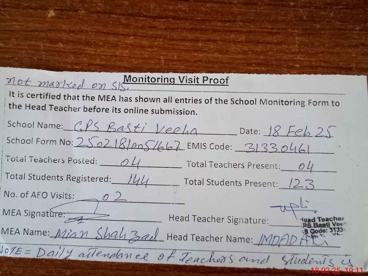 | Attendance Register | Head Teacher | MEA with School | Visit Proof |