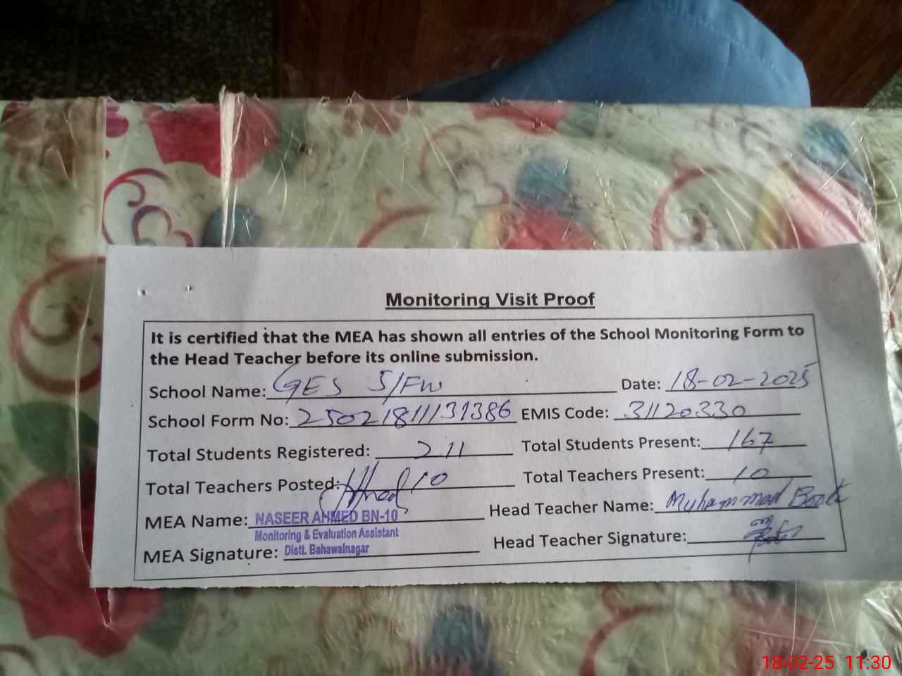 | Attendance Register | Head Teacher | MEA with School | Visit Proof |