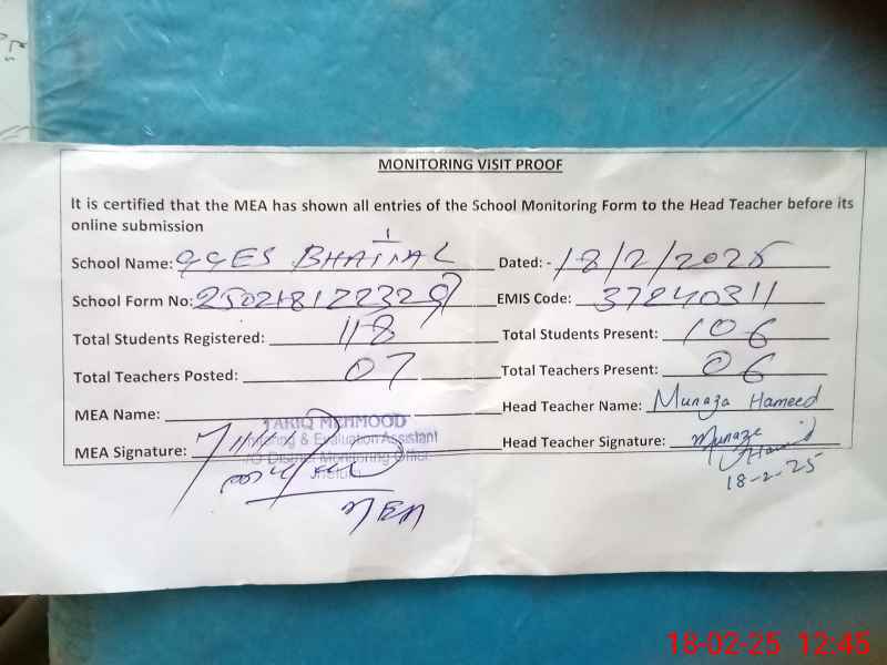 | Certified that this School was Inspected by the Undersigned MEA/DMO Today and the Information Stated Above is as Per Record. | |||||