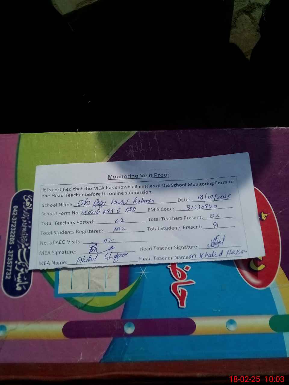 | EMIS Code: 31330940 | Name of School: GPS QAZI ABDUL REHMAN | |||