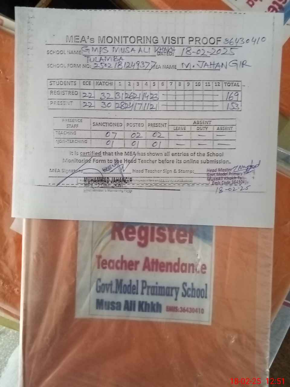 | Attendance Register | Head Teacher | MEA with School | Visit Proof |