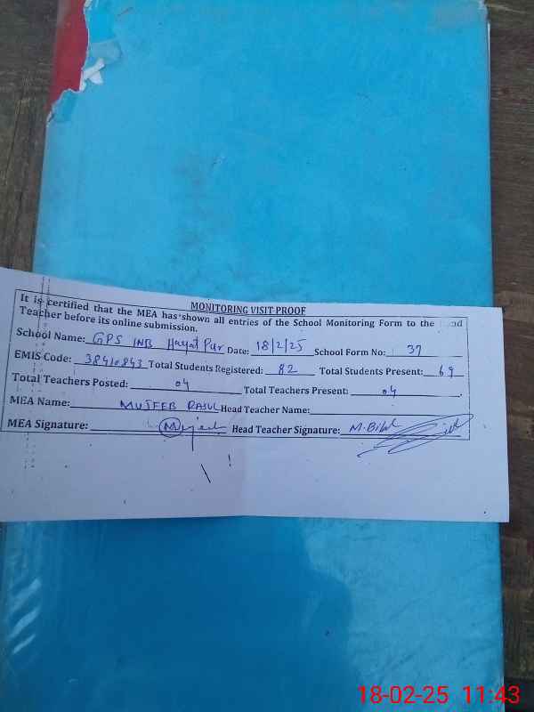 | EMIS Code: 38410843 | Name of School: GPS CHAK NO.1 NB HAYAT ROAD PHULARWAN | |||