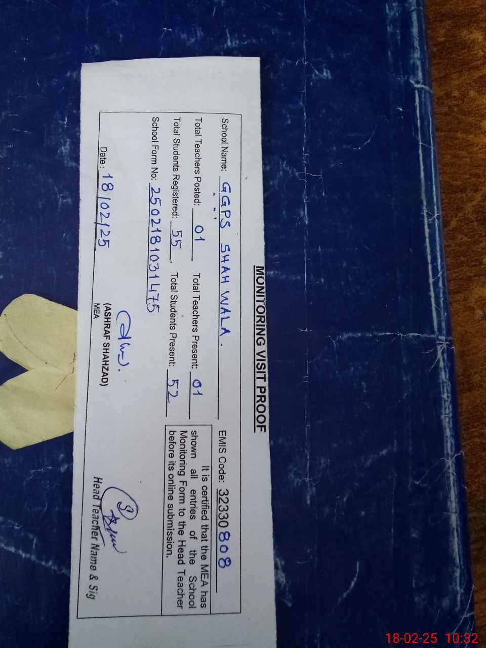 | EMIS Code: 32330808 | Name of School: GGPS SHAH WALA | |||