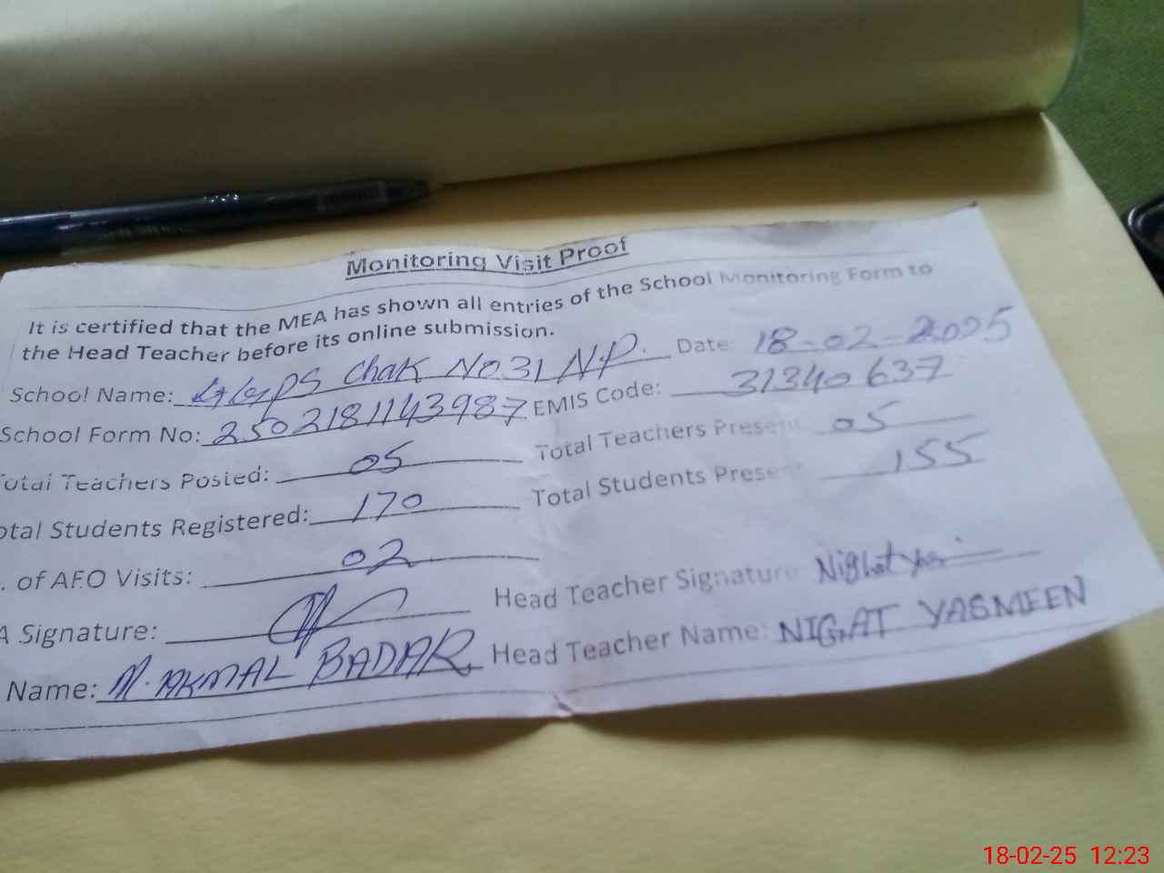 | Attendance Register | Head Teacher | MEA with School | Visit Proof |