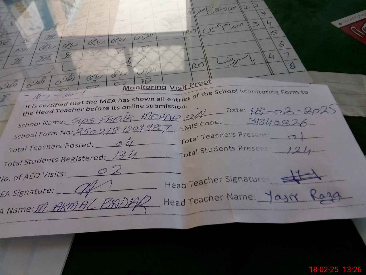 | Attendance Register | Head Teacher | MEA with School | Visit Proof |