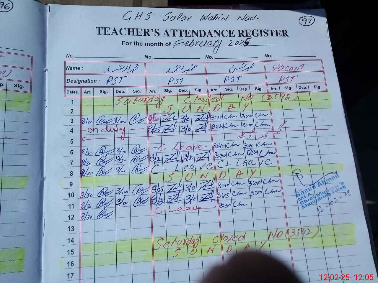 | CNIC | Full Name | Designation | R/C | Absence during last cal. month |