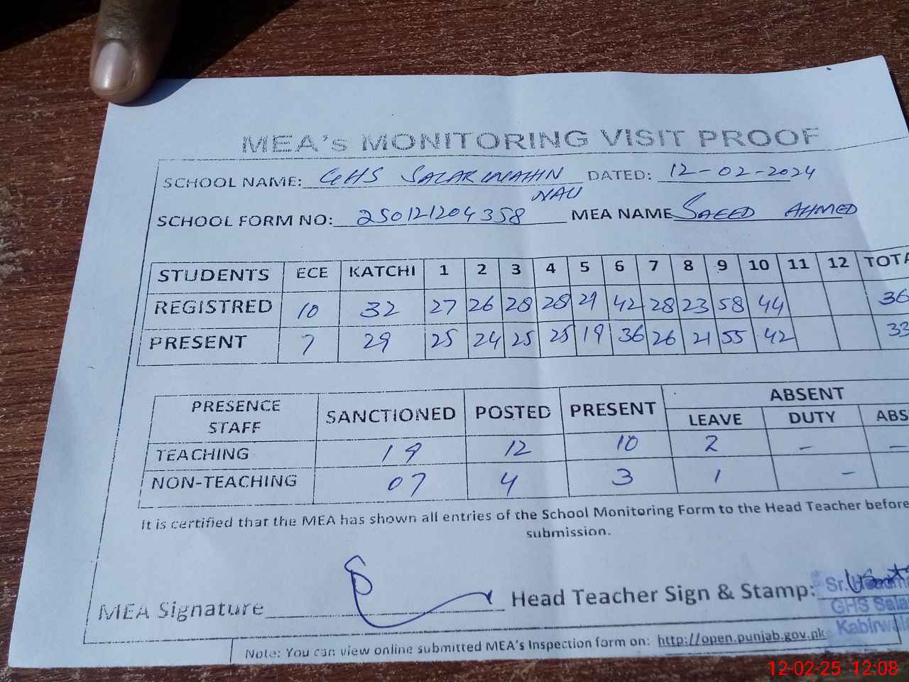 | Attendance Register | Head Teacher | MEA with School | Visit Proof |