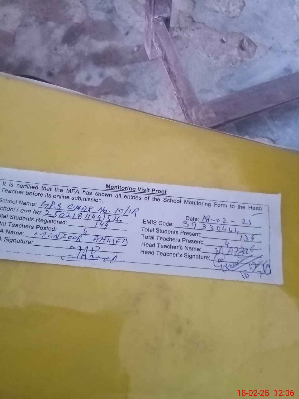 | Attendance Register | Head Teacher | MEA with School | Visit Proof |