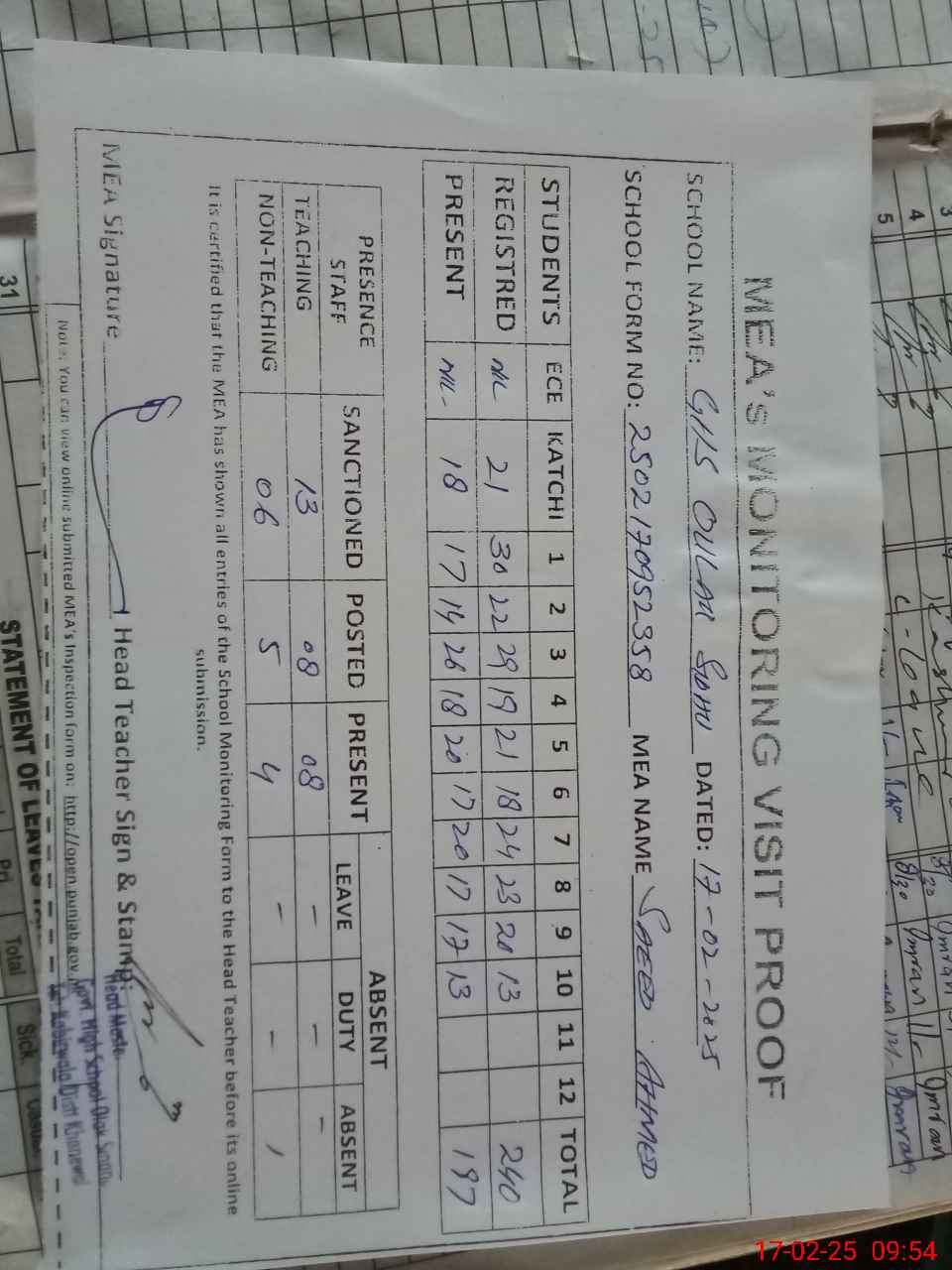 | Attendance Register | Head Teacher | MEA with School | Visit Proof |