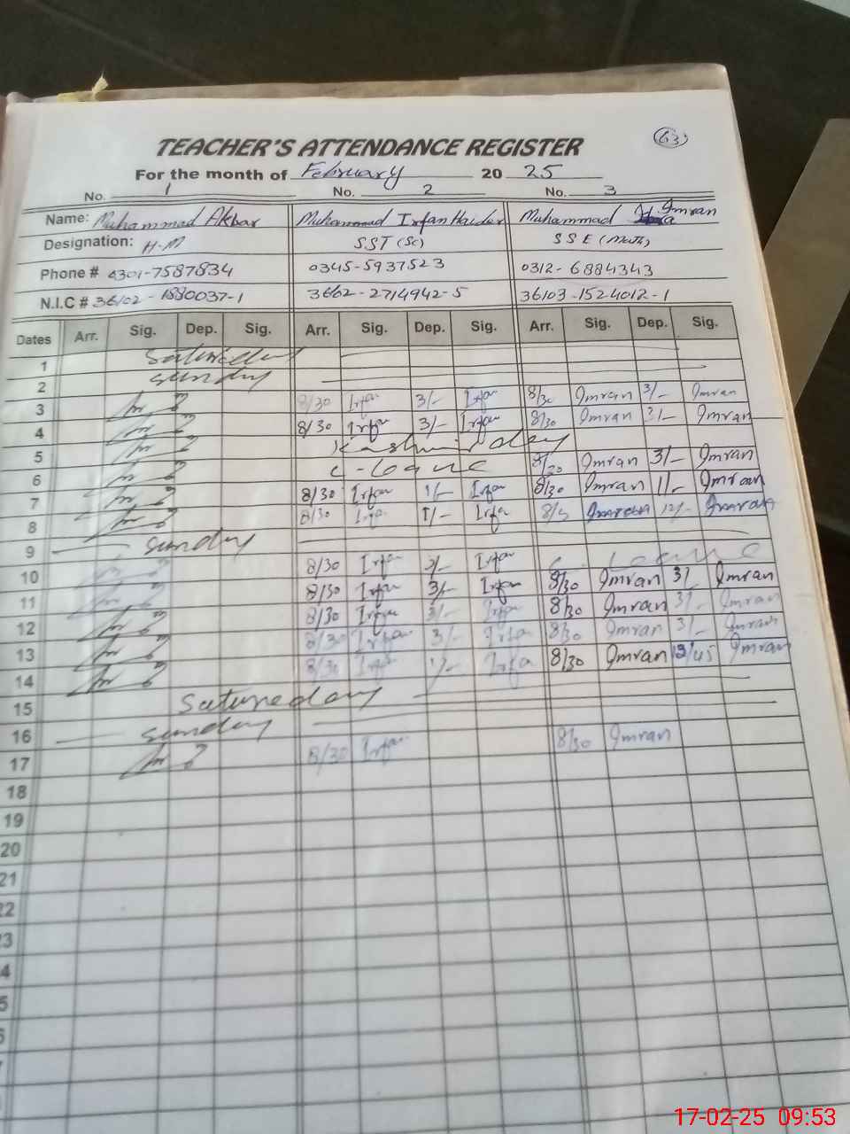 | CNIC | Full Name | Designation | R/C | Absence during last cal. month |