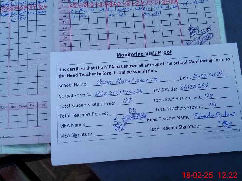 | EMIS Code: 36120268 | Name of School: GGPS RORAY WALA NO.1 SHUJABAD | |||