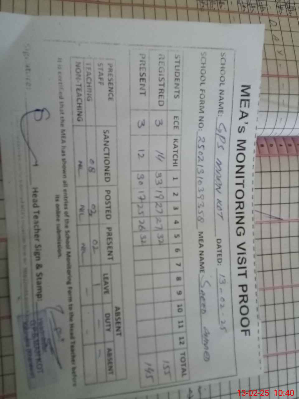 | Attendance Register | Head Teacher | MEA with School | Visit Proof |