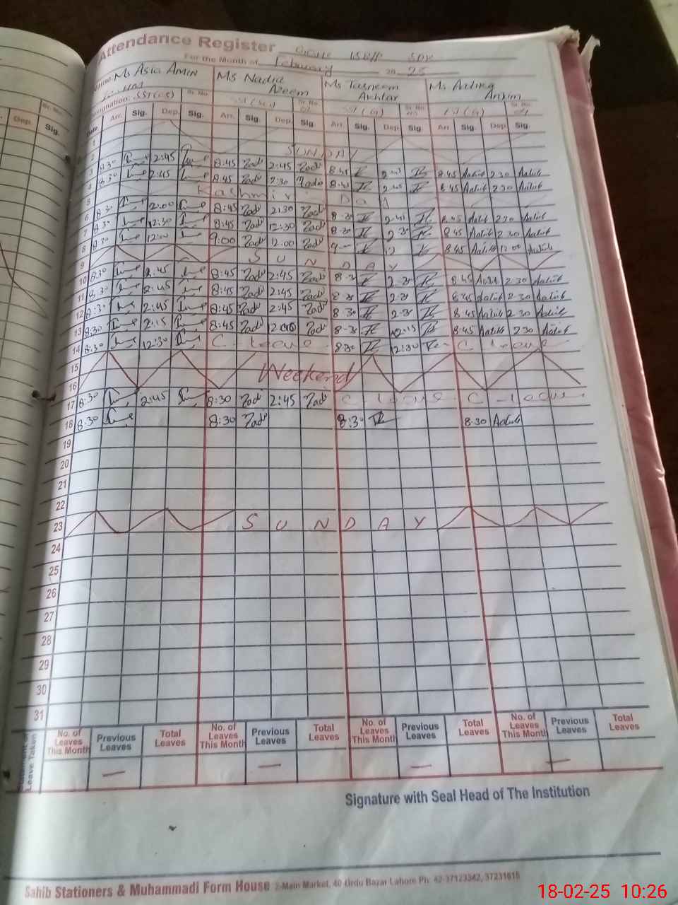 | Leave | Duty | Absent | Maternity | Medical | Ex- Pak |