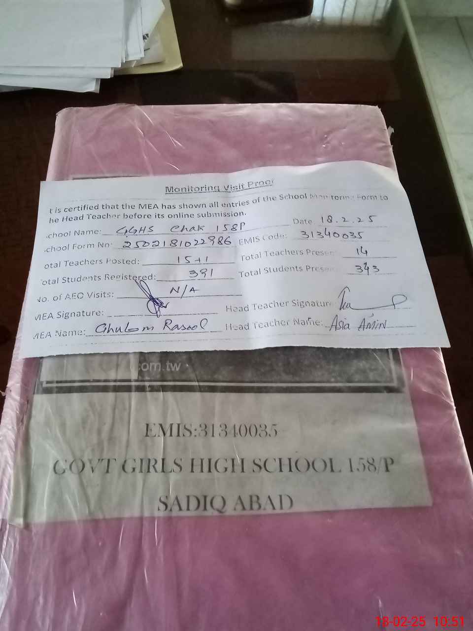 | Name: As**** Am**** Designation: (School Headmaster's/Headmistress's) Incharge HEADMistress Phone/Cell Number: 03**** |
