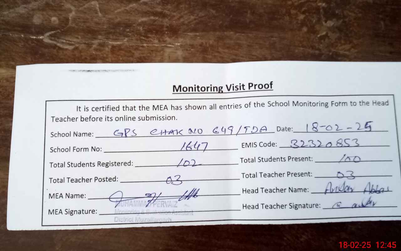 | EMIS Code: 32320853 | Name of School: GPS CHAK NO. 649/TDA | |||