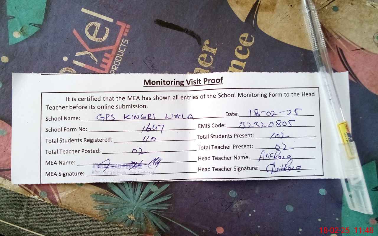 | EMIS Code: 32320805 | Name of School: GPS KINGRI WALA | |||