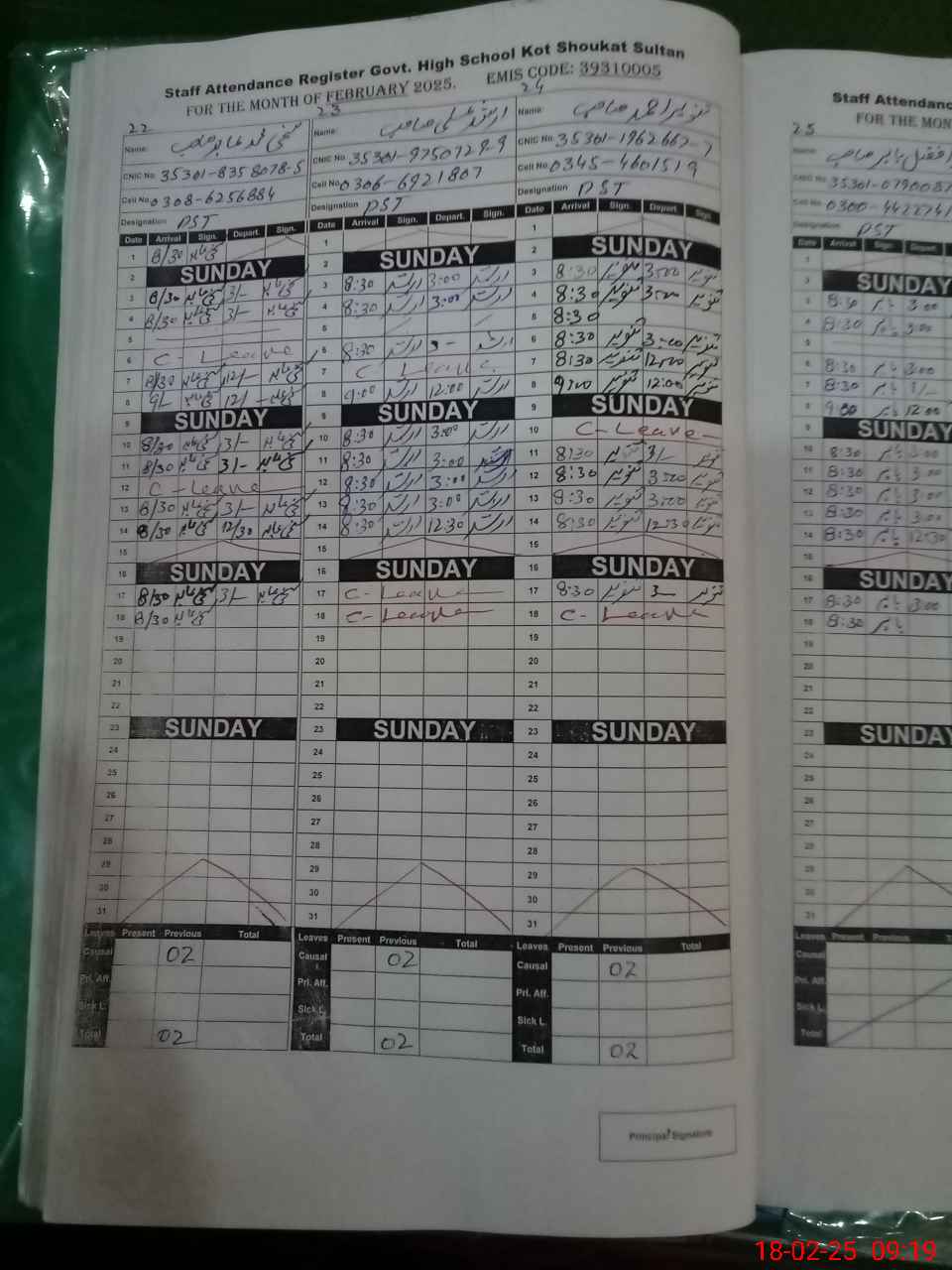 | CNIC | Full Name | Designation | R/C | Absence during last cal. month |