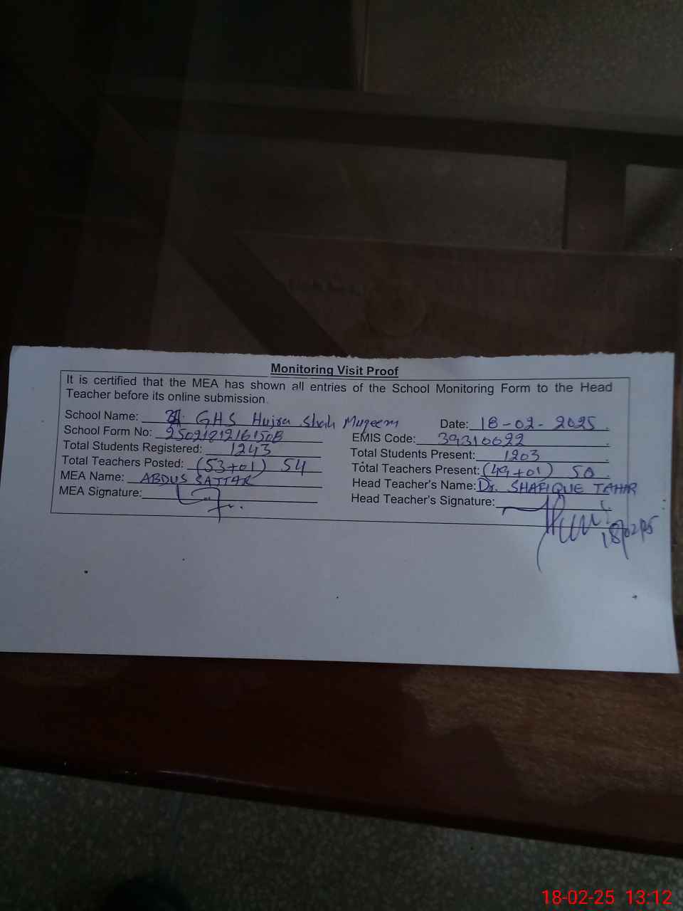 | Attendance Register | Head Teacher | MEA with School | Visit Proof |