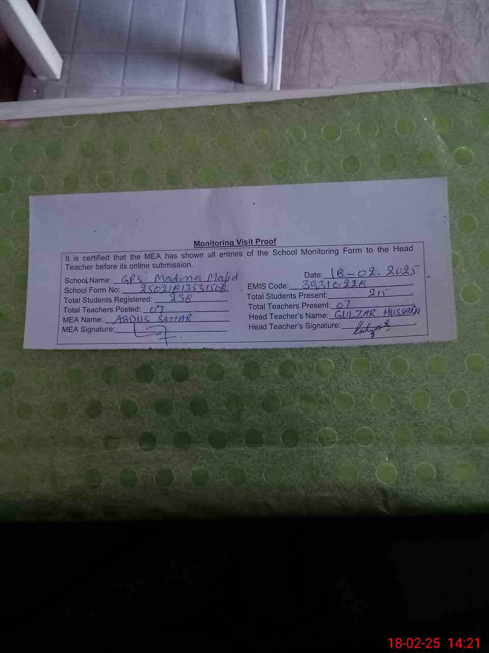 | EMIS Code: 39310228 | Name of School: GPS MADINA MOSQUE HUJRA | |||