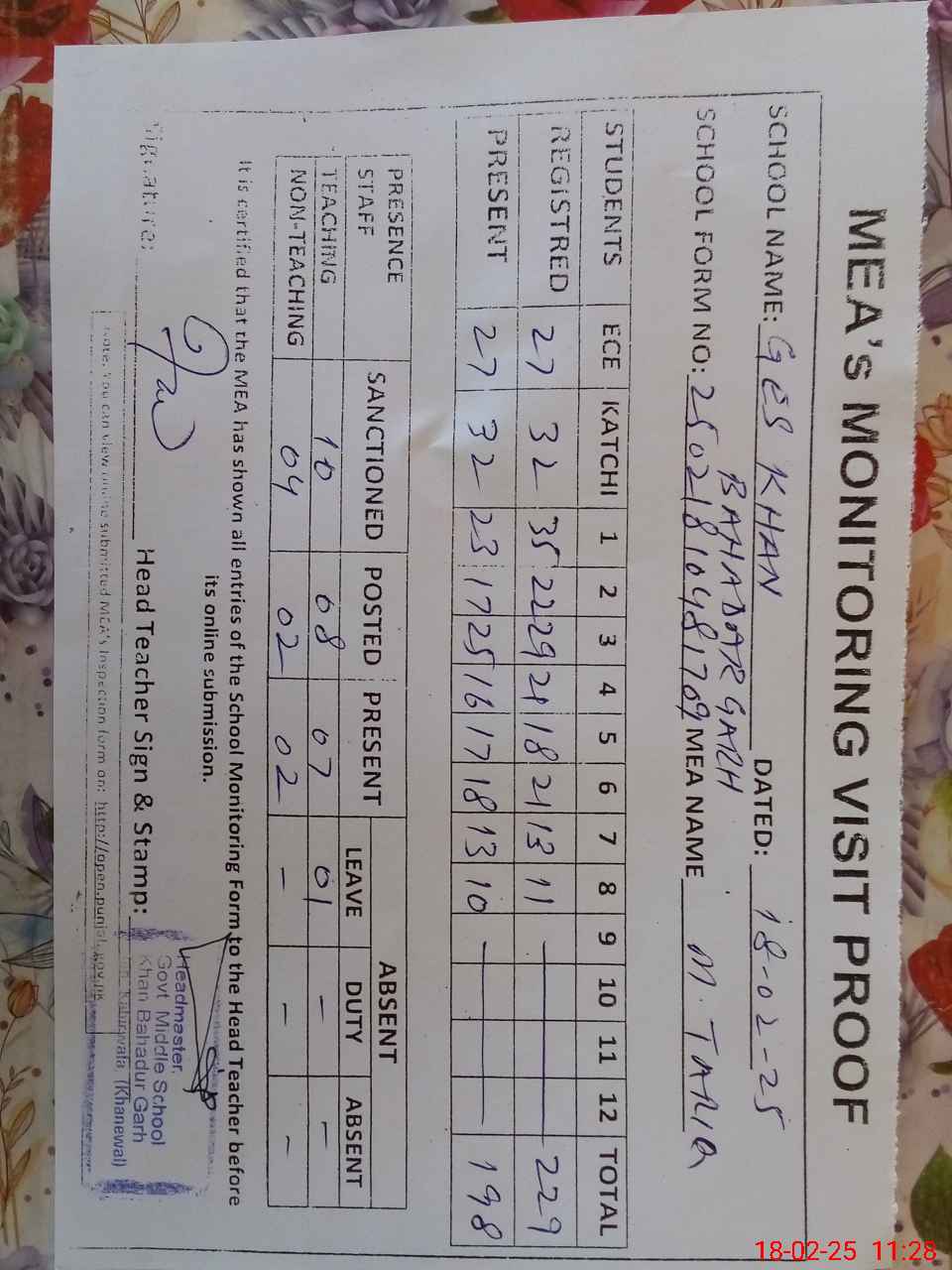 | Attendance Register | Head Teacher | MEA with School | Visit Proof |