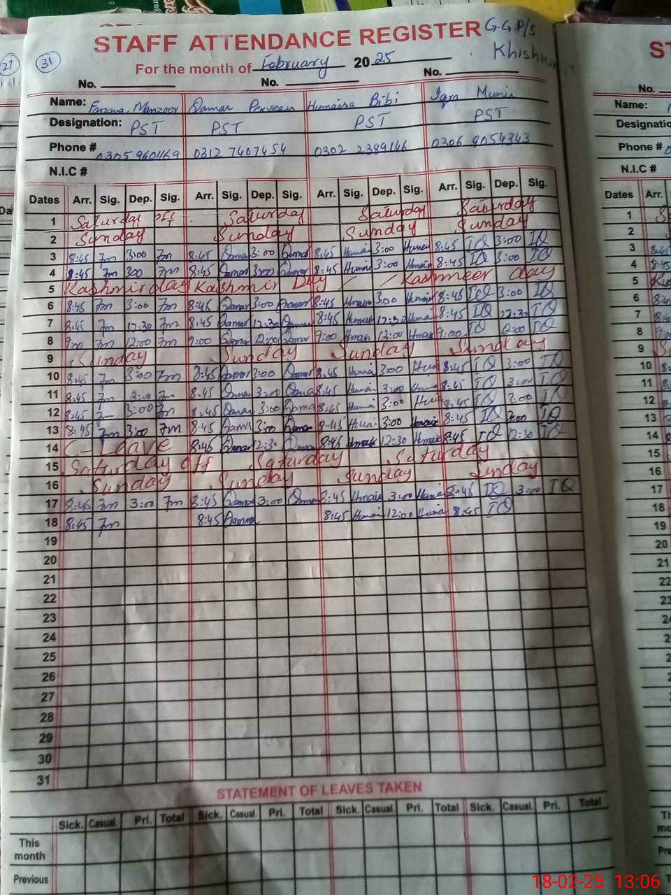 | Leave | Duty | Absent | Maternity | Medical | Ex- Pak |