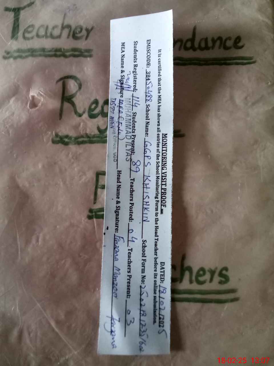 | Attendance Register | Head Teacher | MEA with School | Visit Proof |