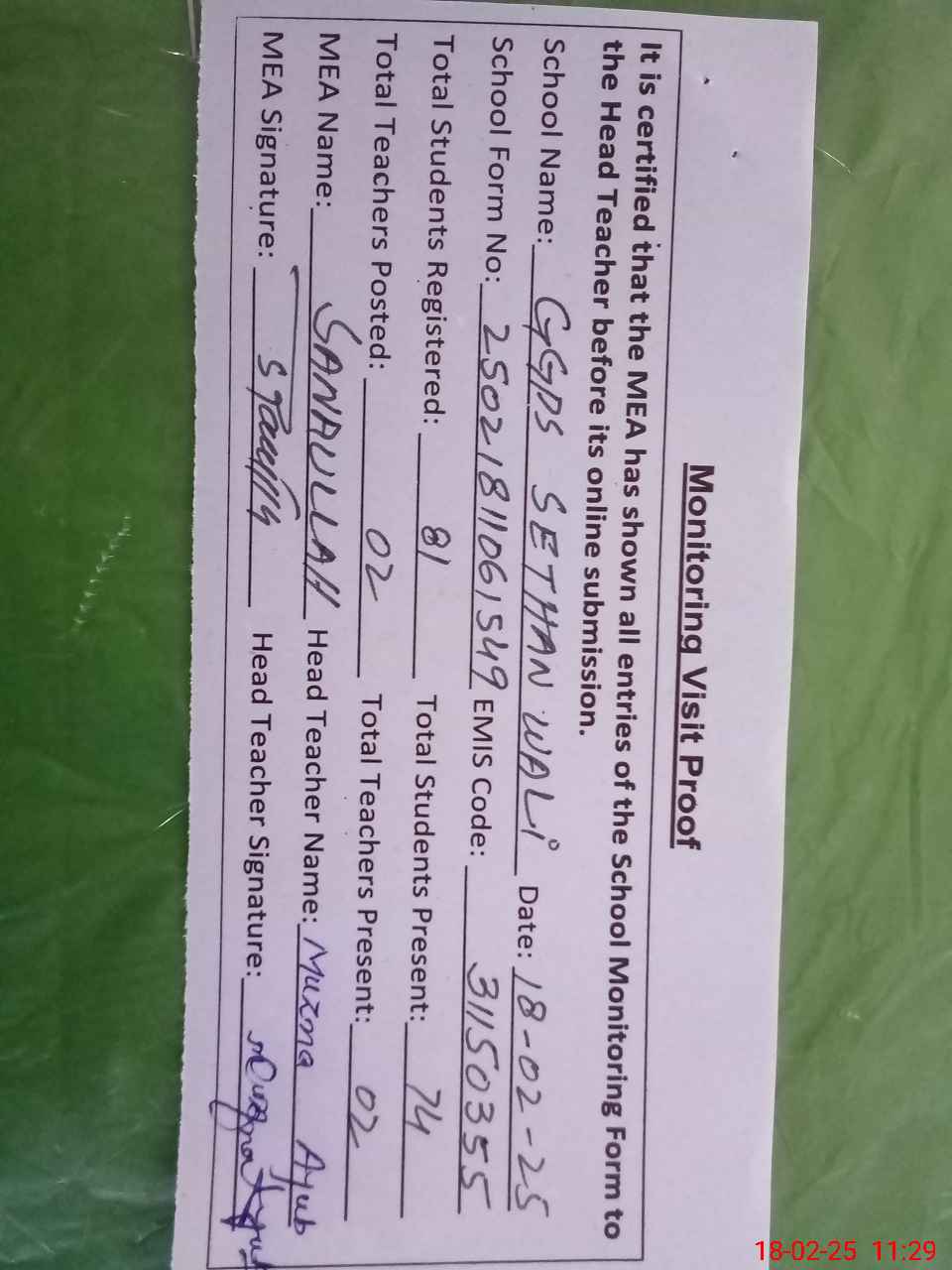 | Attendance Register | Head Teacher | MEA with School | Visit Proof |