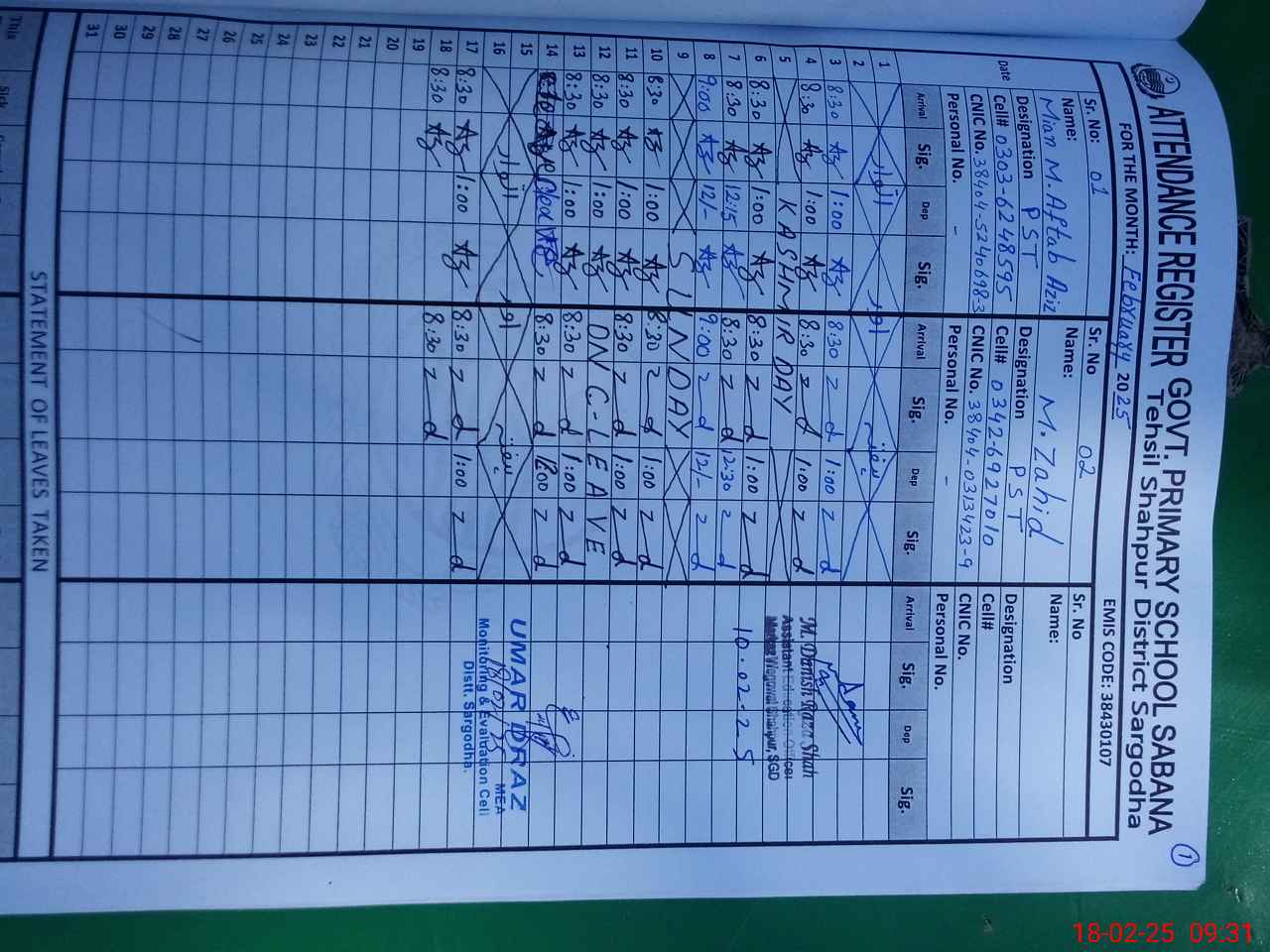 | Name: Af**** Az**** Designation: (School Headmaster's/Headmistress's) PST Phone/Cell Number: 03**** |