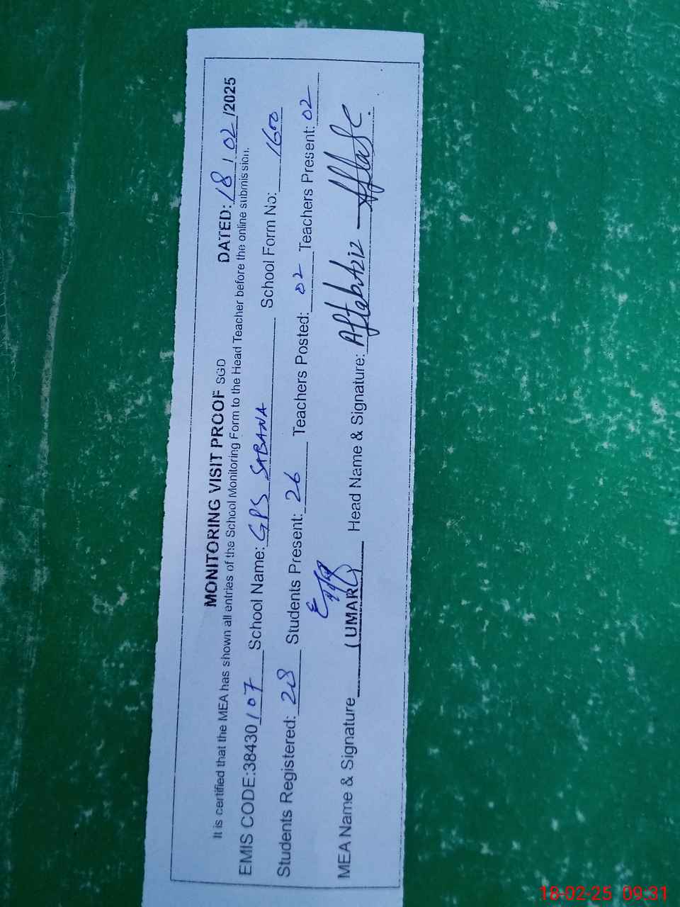 | Attendance Register | Head Teacher | MEA with School | Visit Proof |