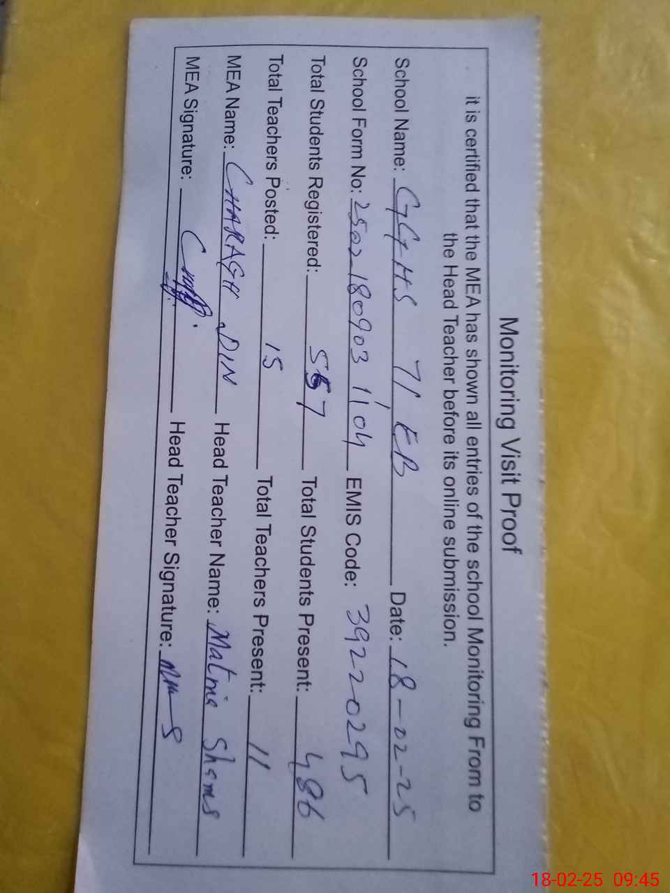 | Attendance Register | Head Teacher | MEA with School | Visit Proof |