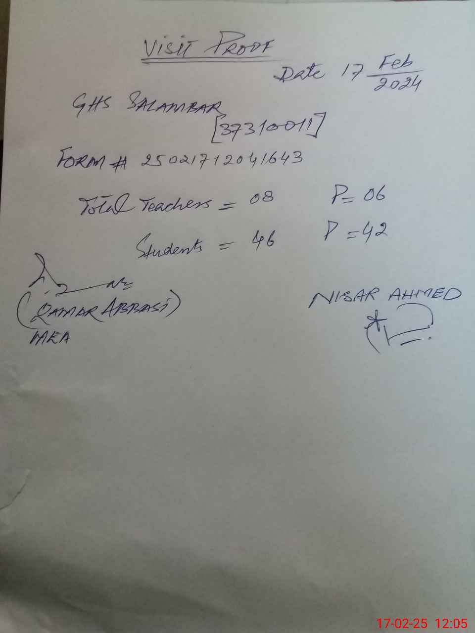 | Attendance Register | Head Teacher | MEA with School | Visit Proof |