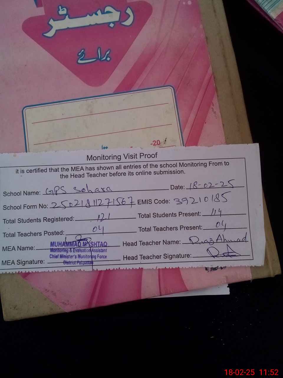 | Attendance Register | Head Teacher | MEA with School | Visit Proof |