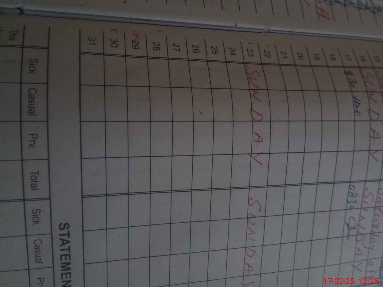 | CNIC | Full Name | Designation | R/C | Absence During Last Calender Month |