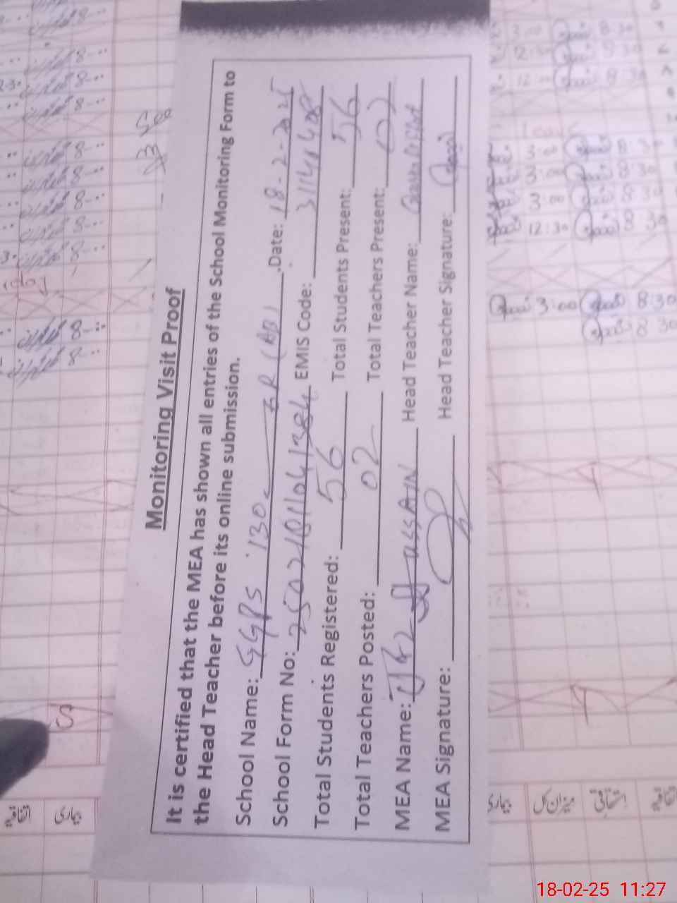 | Attendance Register | Head Teacher | MEA with School | Visit Proof |