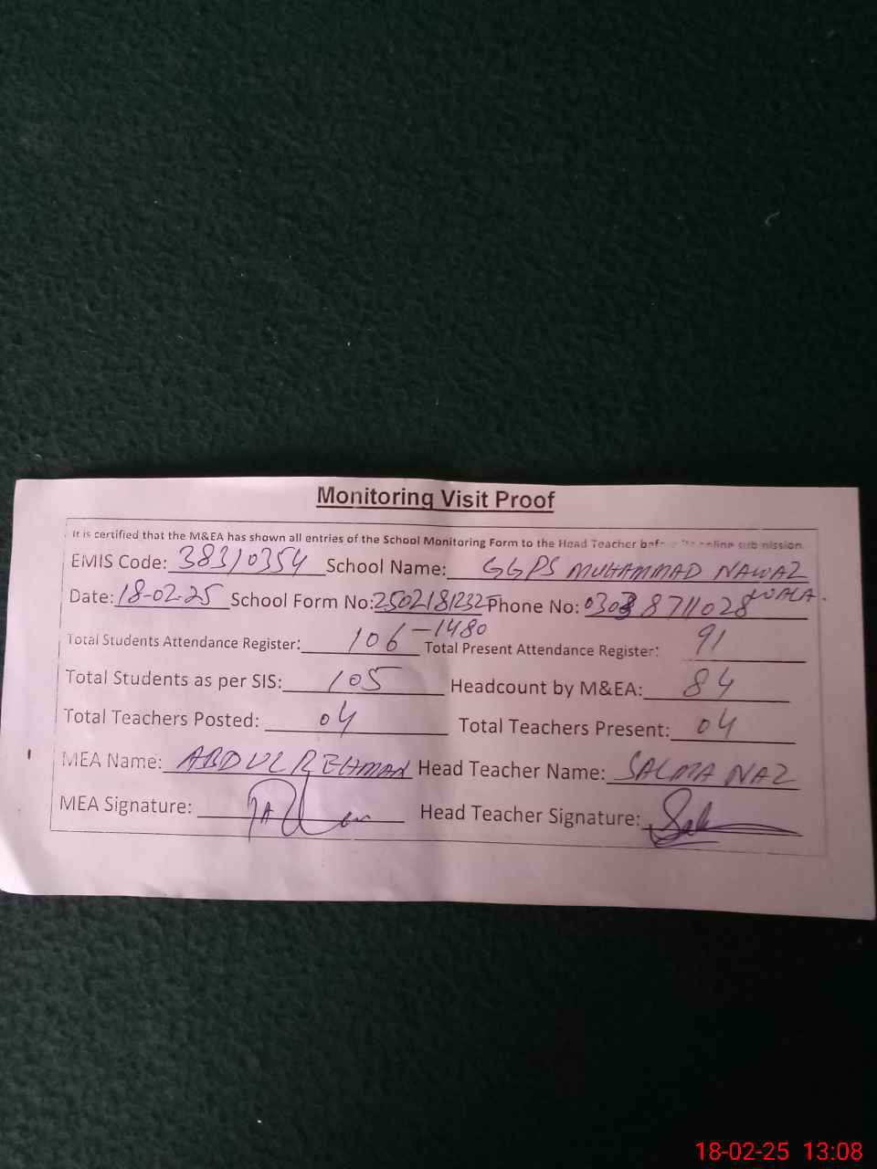 | Attendance Register | Head Teacher | MEA with School | Visit Proof |