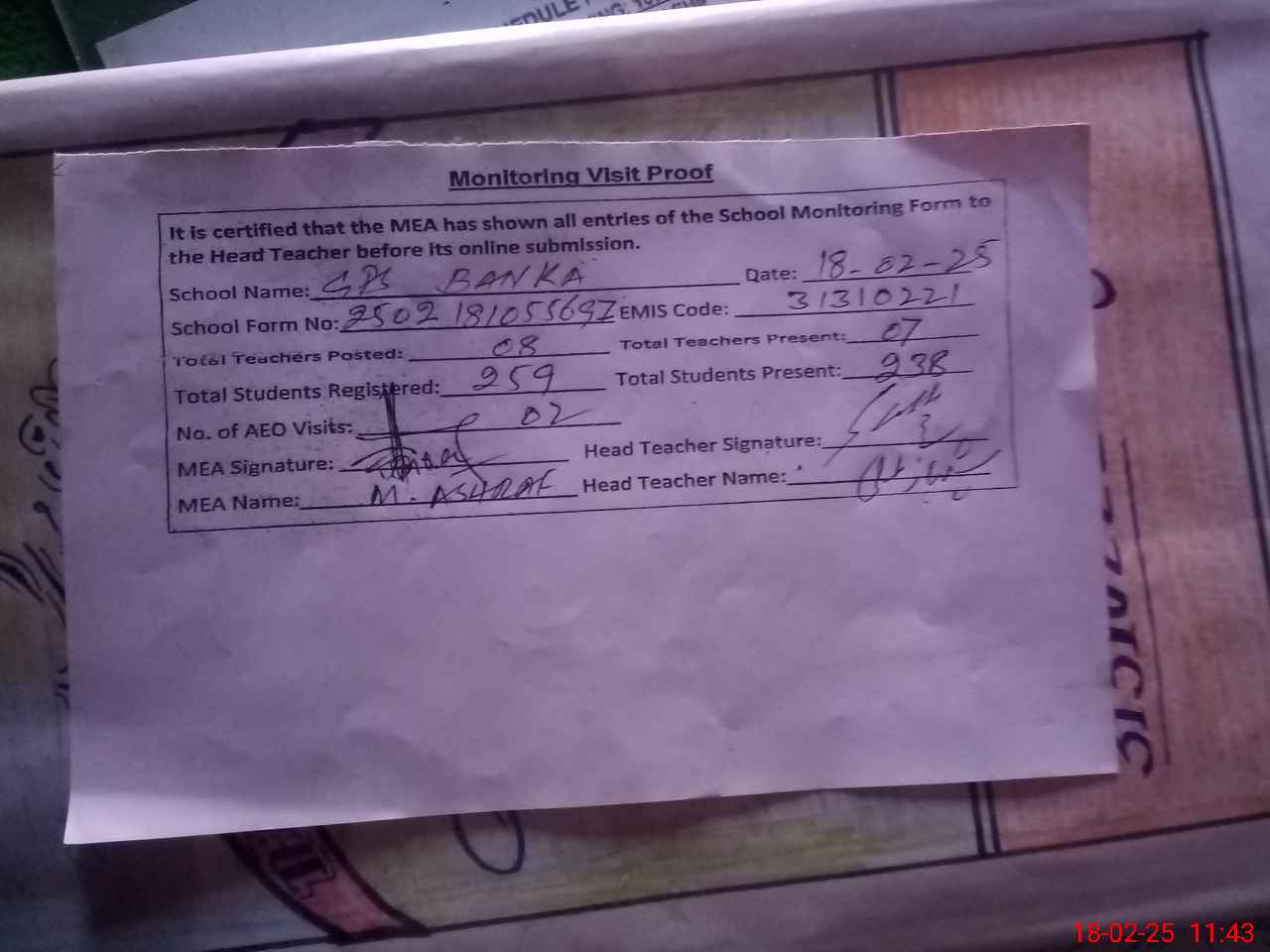 | EMIS Code: 31310221 | Name of School: GPS BANKA (After Noon) | |||