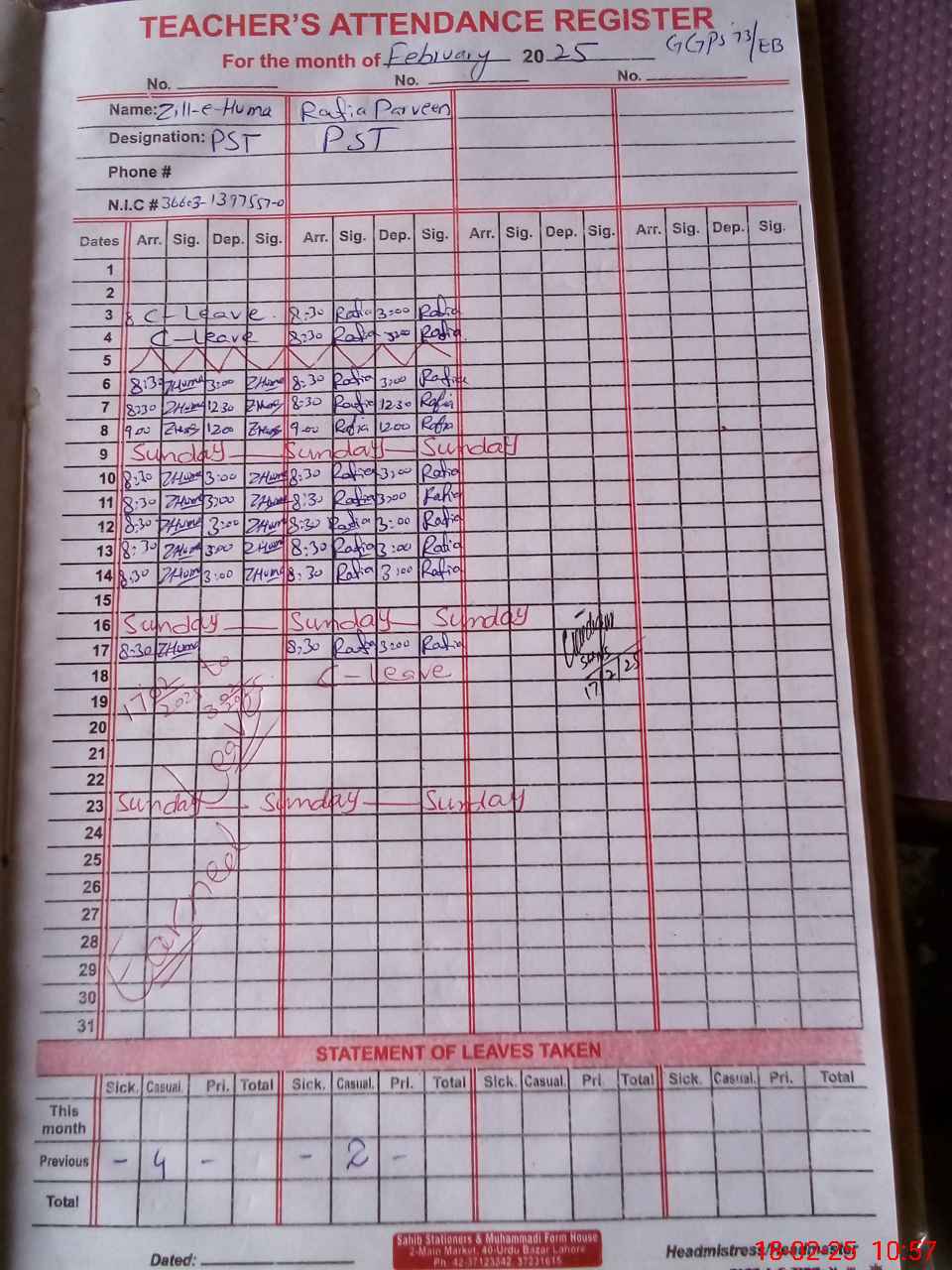 | CNIC | Full Name | Designation | R/C | Absence During Last Calender Month |