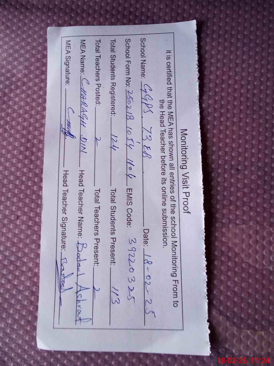 | Attendance Register | Head Teacher | MEA with School | Visit Proof |