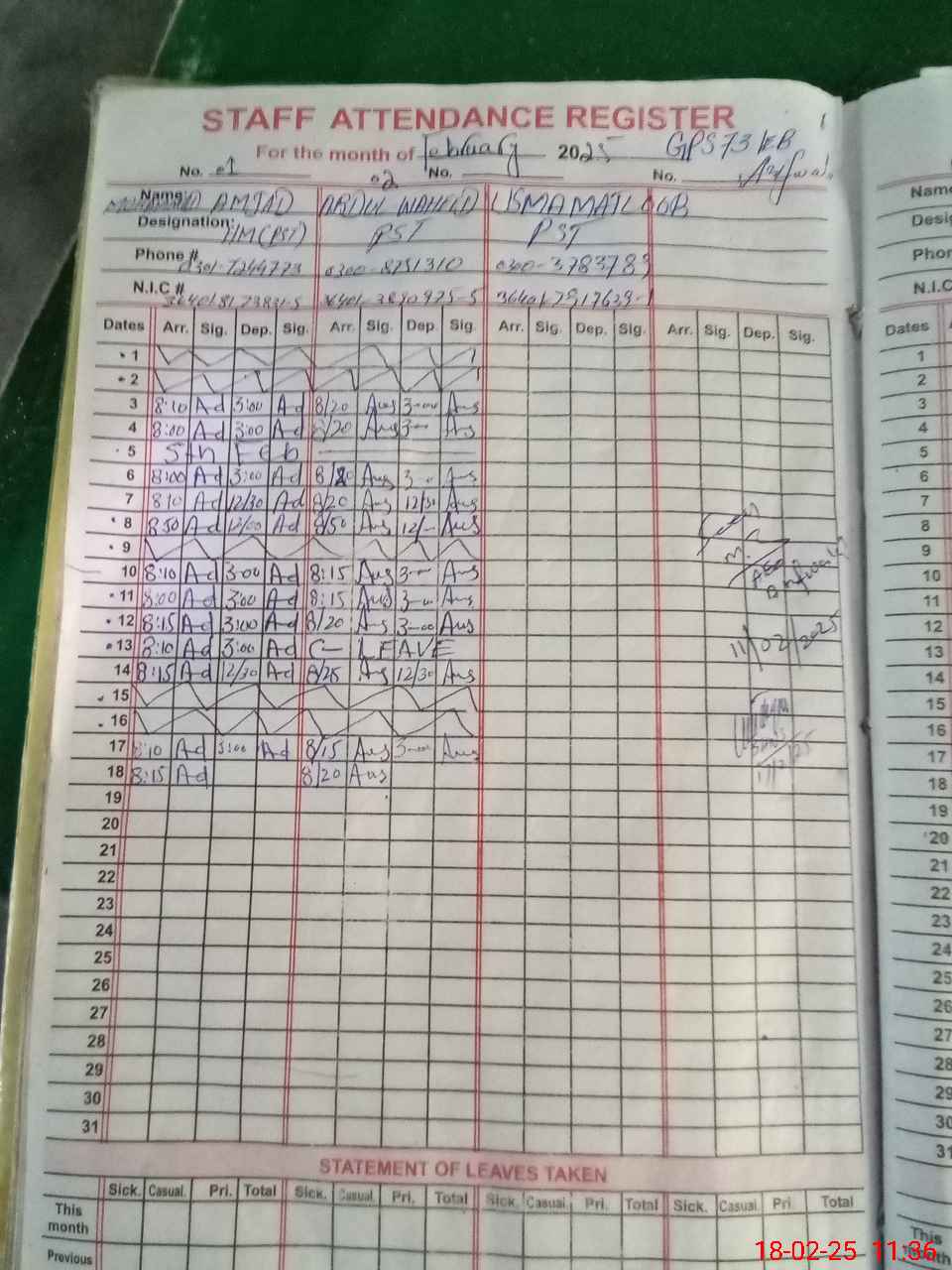 | CNIC | Full Name | Designation | R/C | Absence during last cal. month |